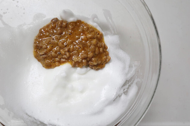 ②卵黄に納豆と付属のタレとからしも混ぜて、卵白に加える。