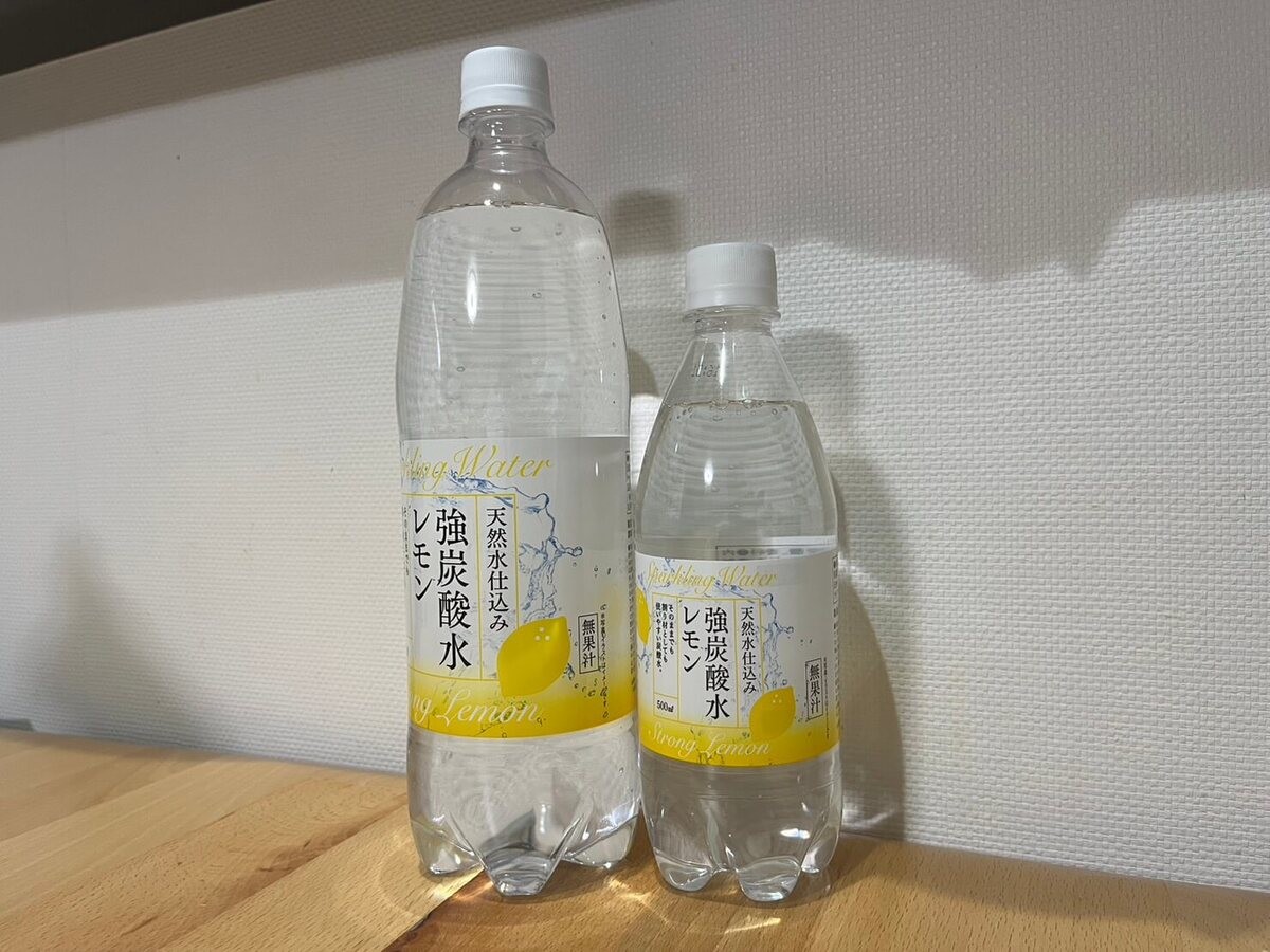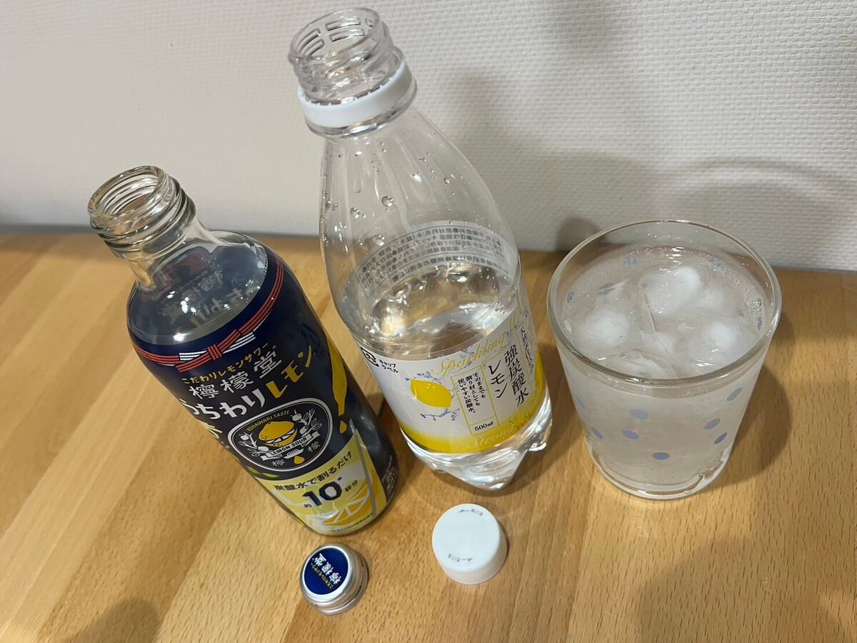 檸檬堂うちわりレモン(399円)と強炭酸水レモン(69円)2本の計537円で濃いめのレモンサワーが10杯分楽しめます。