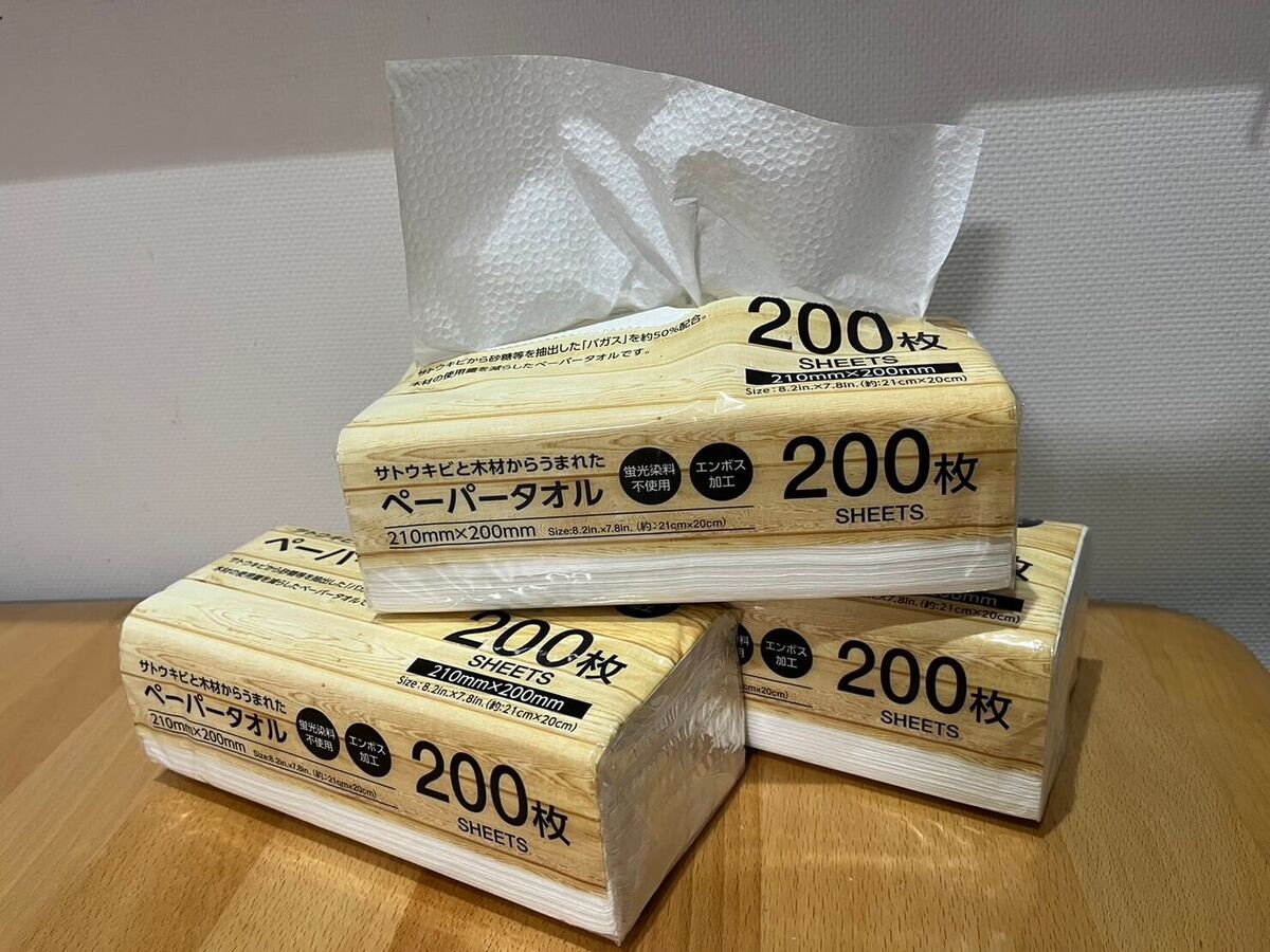 こちらのペーパータオルは1セット200枚×3個の合計600枚でお値段が279円。