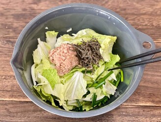 オイルを切ったツナ缶と塩昆布を、白菜と小ねぎの入ったボウルに入れて、和えてください。