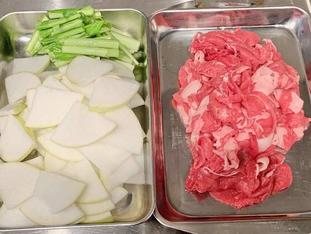 牛肉大根レシピ①牛肉に下味をもみ込み、大根は3㎜の厚さに切る