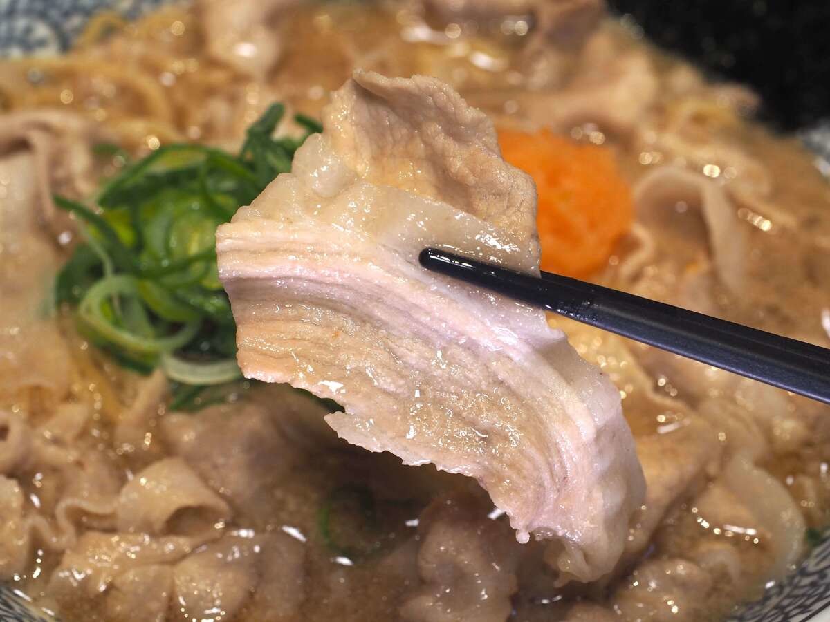 豚肉はもっと細やかにカットされているのかと思いきや、そんなことはなくどっしりしてますね。ほどよく脂身があってやわらかく、旨味が感じられます。肉だけでおいしい。