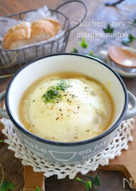 1人分ならレンチン新玉ねぎスープを試してみませんか?火を使わず耐熱カップひとつで作れるので後片付けまでラクラク。チーズは後乗せで余熱でとろりと溶かします。お好みで黒胡椒やパセリを振ってどうぞ。