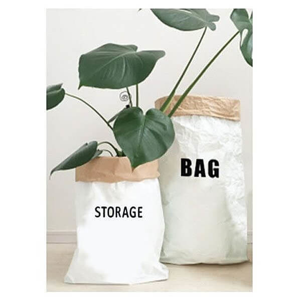 清潔感のあるホワイトカラーにシンプルな黒字が映えるペーパーストレージバッグです。衣類や食料品など生活感があるアイテムを収納することで、見せる収納としてお部屋の雰囲気が一気におしゃれになります。
