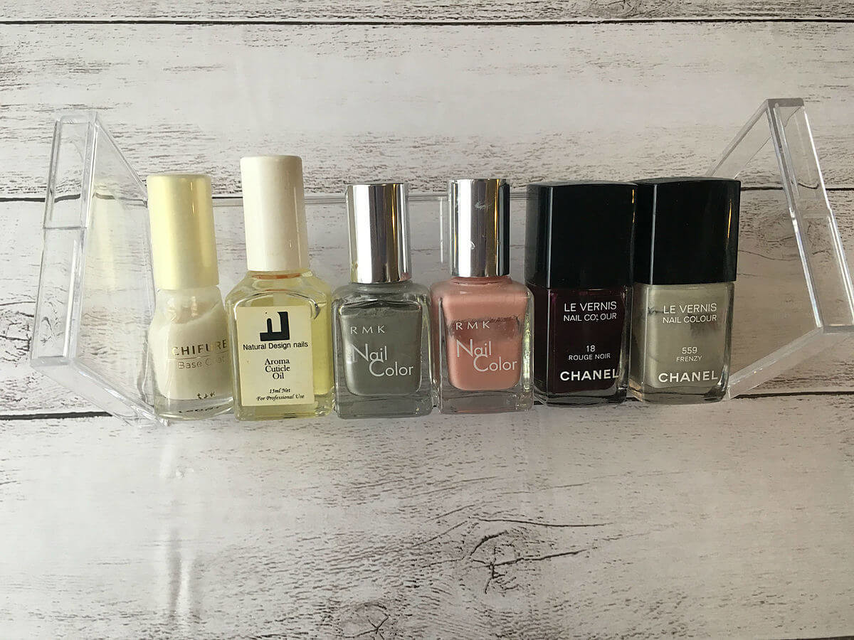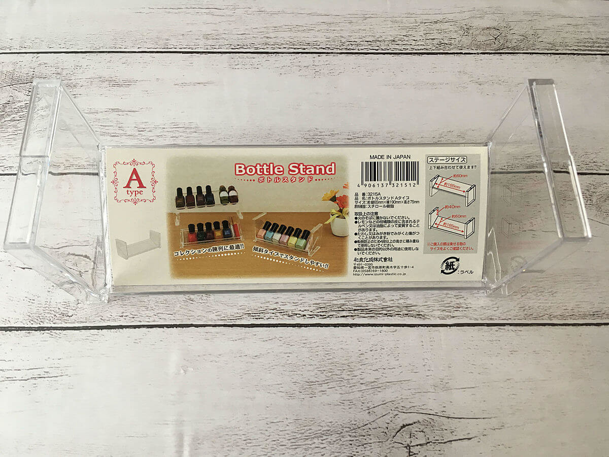 マニキュアなどの小さめのボトルを斜めに立てて収納できるスタンドです。1段1段バラバラに販売されているので、好きな段数に積み重ねて使用できます。