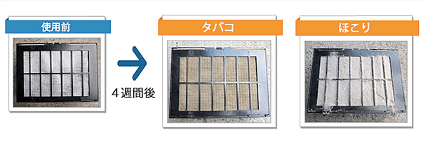 でも、実は使い始めたその瞬間から、空気清浄機は性能(集塵力)を落としているんです。たった4週間でも、空気の見えない汚れがフィルターにびっしり。