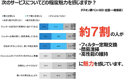実際に、このサービスの特徴に関するアンケートによれば、定期ケアに加えて掃除が手軽になること、そして、空気清浄機をいつまでもきれいな状態で使えることに魅力を感じている人が多いようです。
