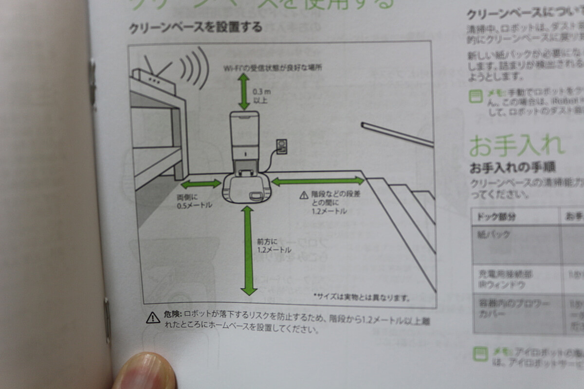お掃除ロボットが発着するベースの設置スペースの確保が必要です。