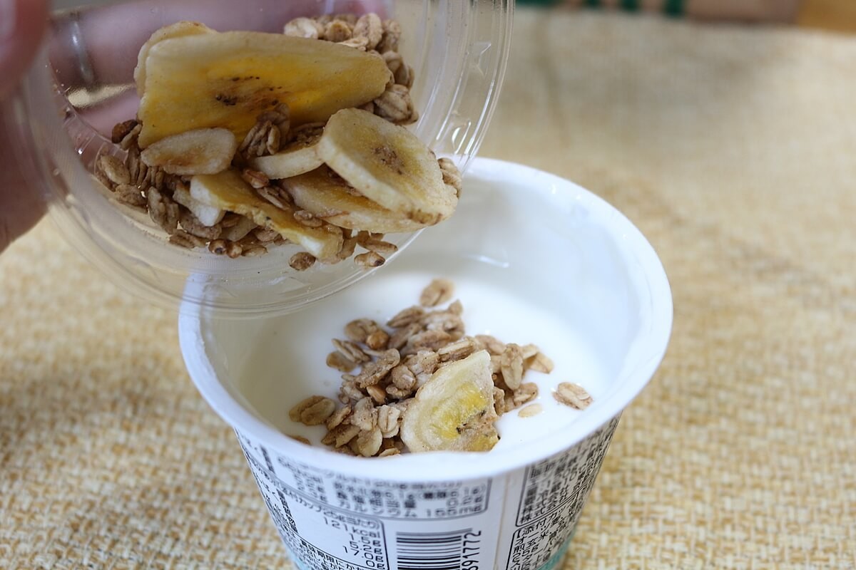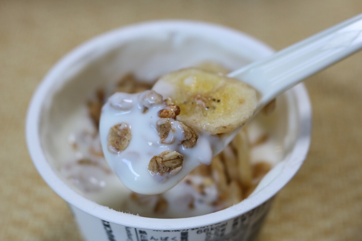 6月に新登場した、砂糖不使用の低脂肪ヨーグルトと玄米グラノーラ・バナナチップの「ヨーグルト&グラノーラバナナ」です。