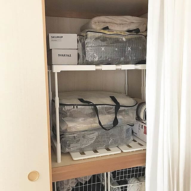 不揃いで収納場所に悩む布団。ニトリの「幅の調整ができる押入れラック」を使って布団をスッキリと収納しているのは@namiheeeeyさん。