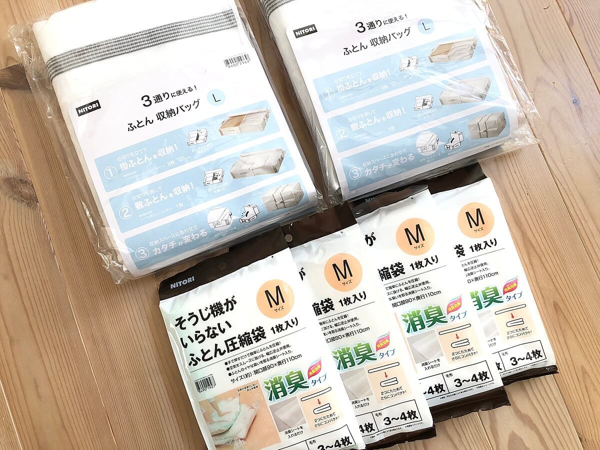 片付け遊び指導士でヨムーノライターのアリカさんが押入れの見直しに使ったのは、ニトリの「掃除機がいらない消臭布団圧縮袋」と「3通りに使えるふとん収納バッグ」。