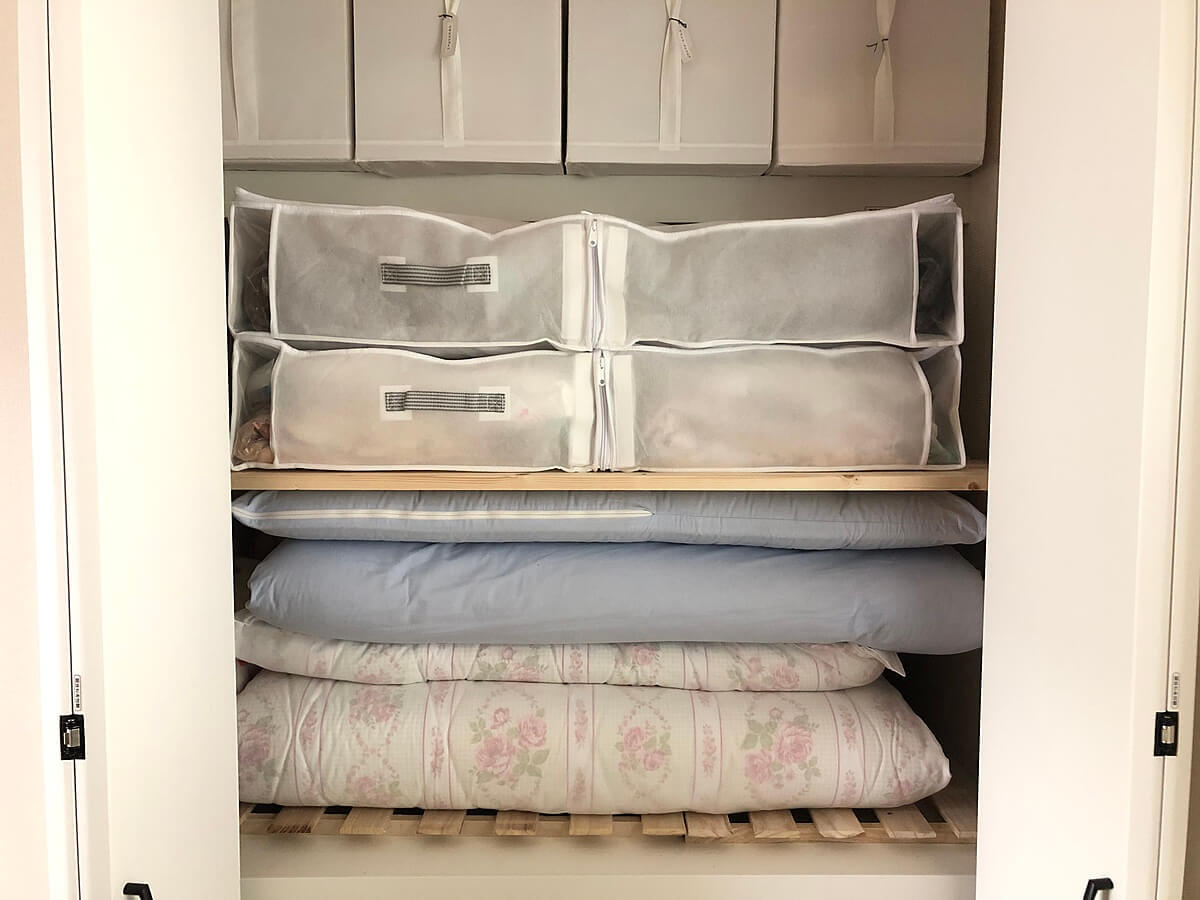 不揃いな布団がスッキリ収納できて、デッドスペースが有効活用できますね。