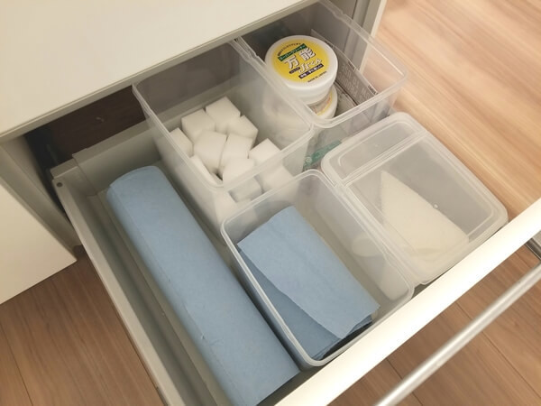 ちょっとした掃除に便利な大きさに切ったメラミンスポンジと4分の1に切ったショップタオルも一緒に収納しています。