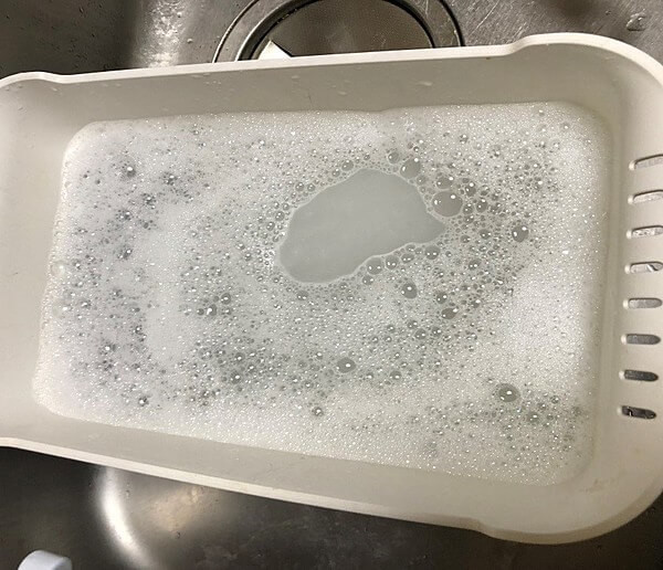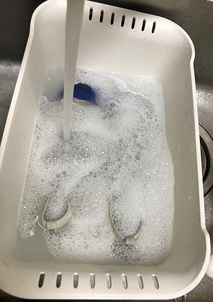まず持ち帰った日に、お湯(60度前後)にオキシクリーンを溶かして漬けておきます。