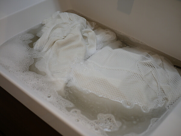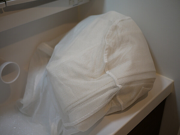 そのままきれいに折りたたんで、ネットにカーテンフックを付けたまま入れます。 60度のお湯で溶かしたオキシクリーンに30分~1時間、ネットに入れたカーテンを漬け置きします。