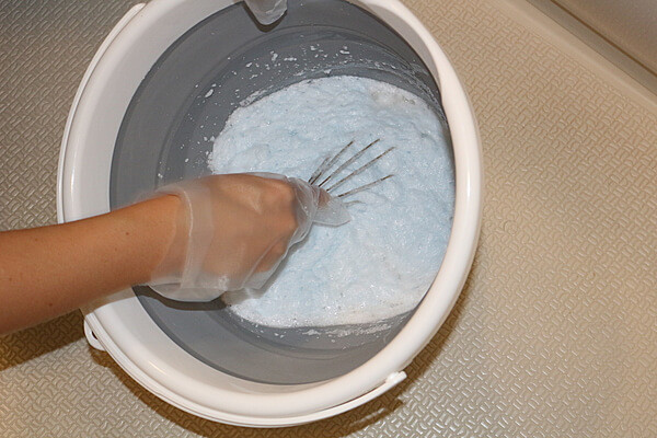 オキシクリーンの粉末を40度~60度のお湯でしっかり溶かします。