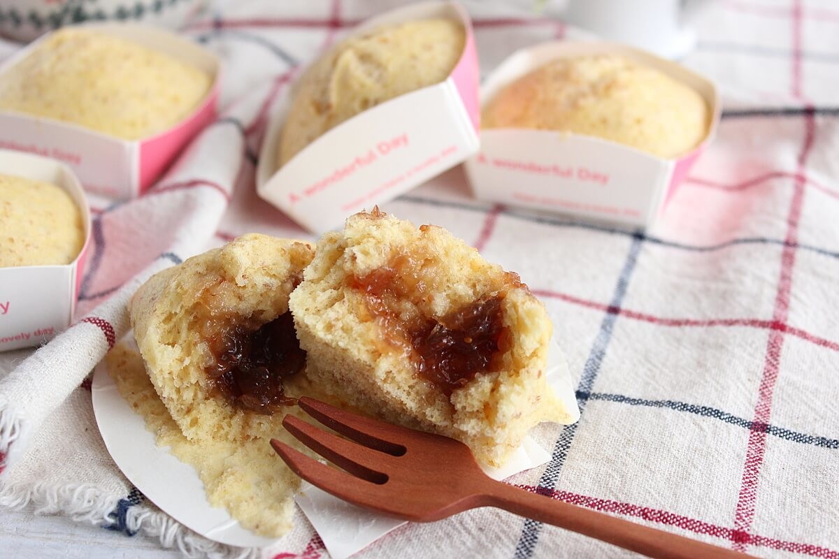- 器に均等に入れ、スプーン1杯ほどのジャムをそれぞれに入れ、蒸し器で強火で10分ほど蒸す。