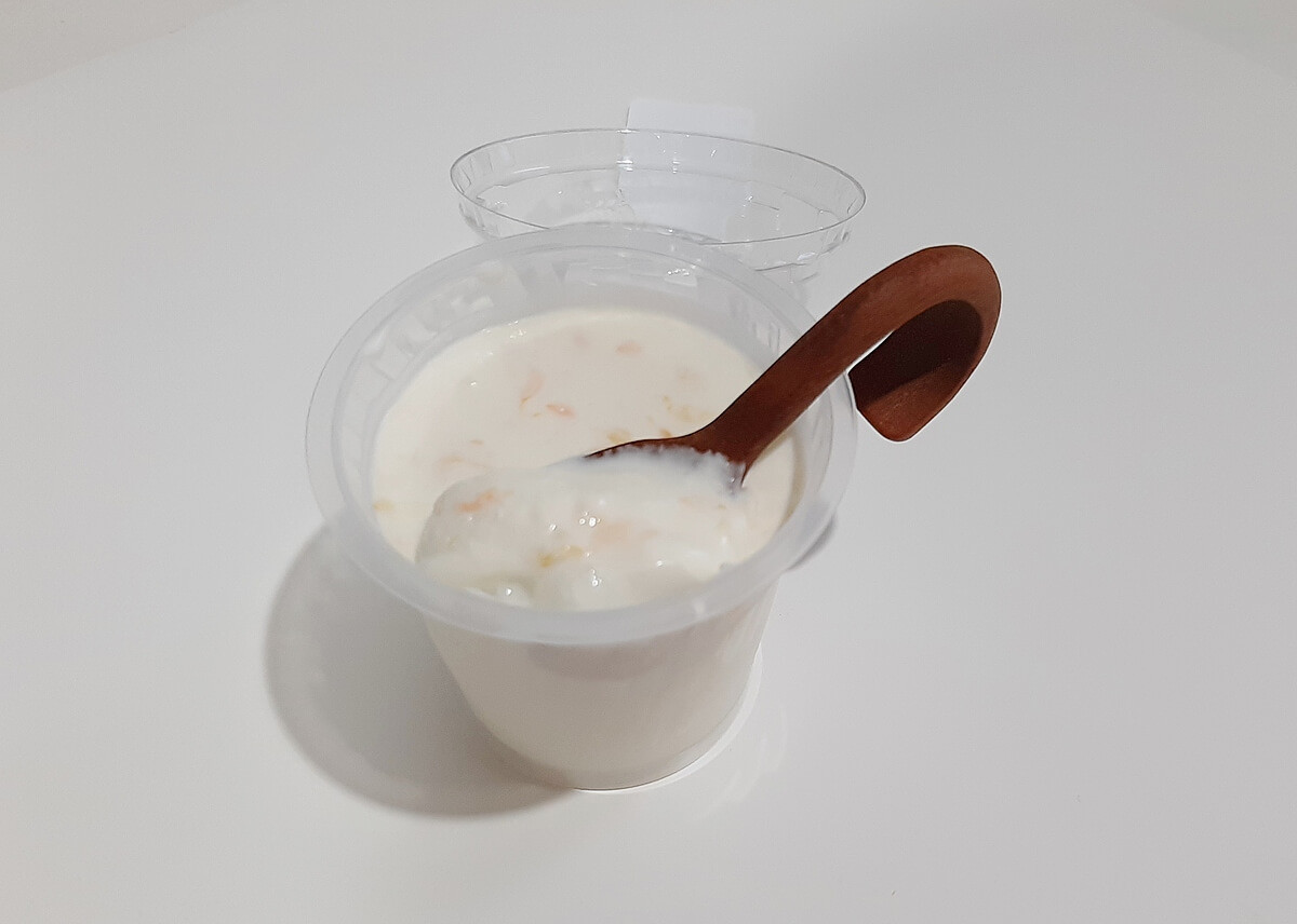 つるんとした牛乳寒天の上に、オレンジとみかんの粒々を混ぜたやわらかいホイップクリームがのっています。一緒に食べると牛乳寒天に爽やかな甘さもプラス。
