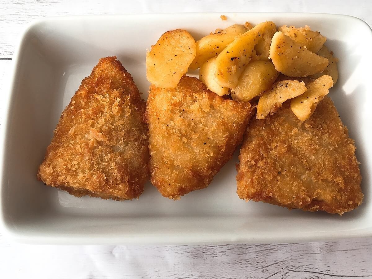 白身魚のフライが3切れと、フライドポテトが10個入っています。