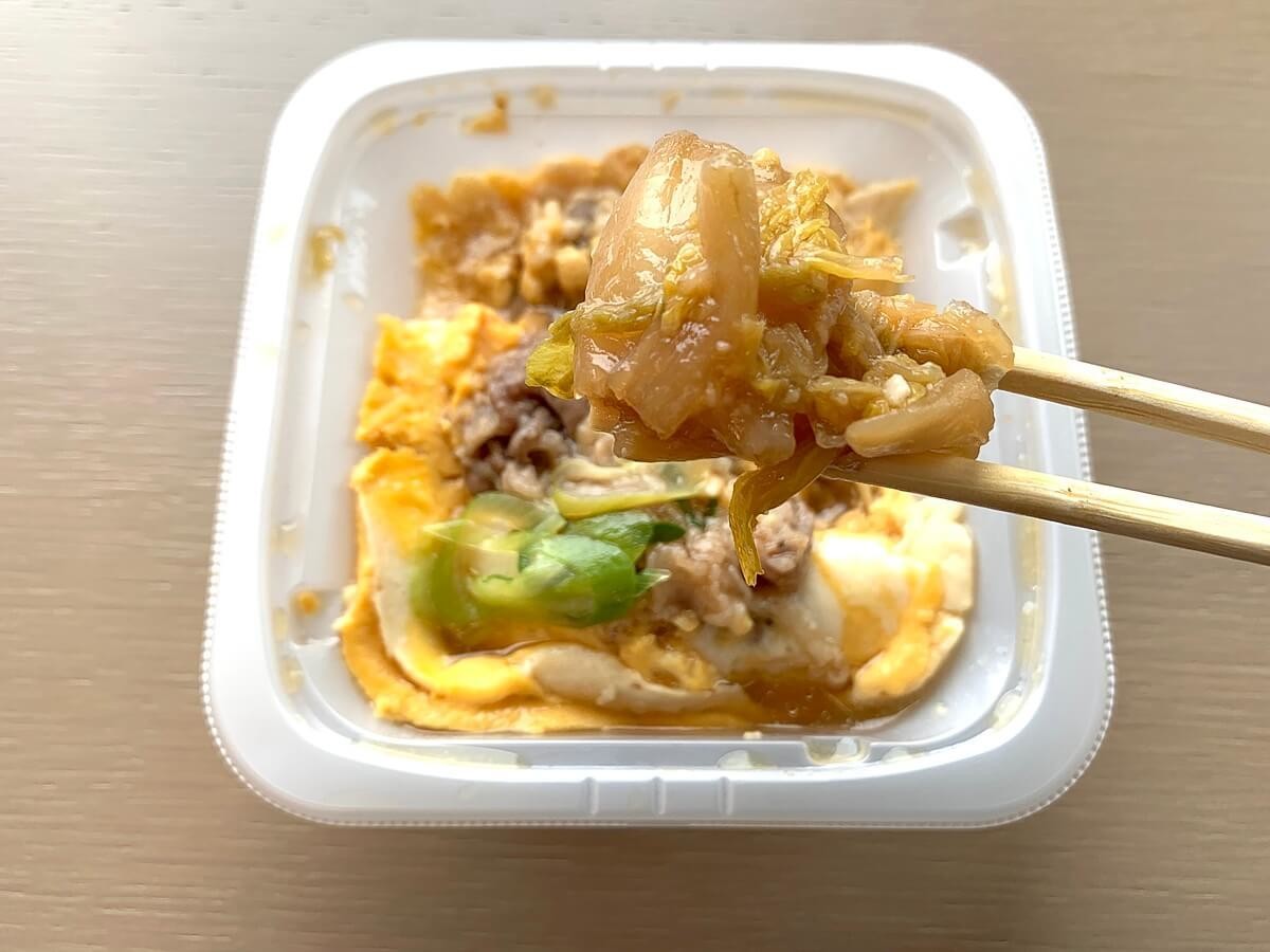 玉子と牛肉、トッピングのねぎだけかと思いましたが、白菜や玉ねぎも入っていて、野菜も一緒に食べられるのがうれしい。
