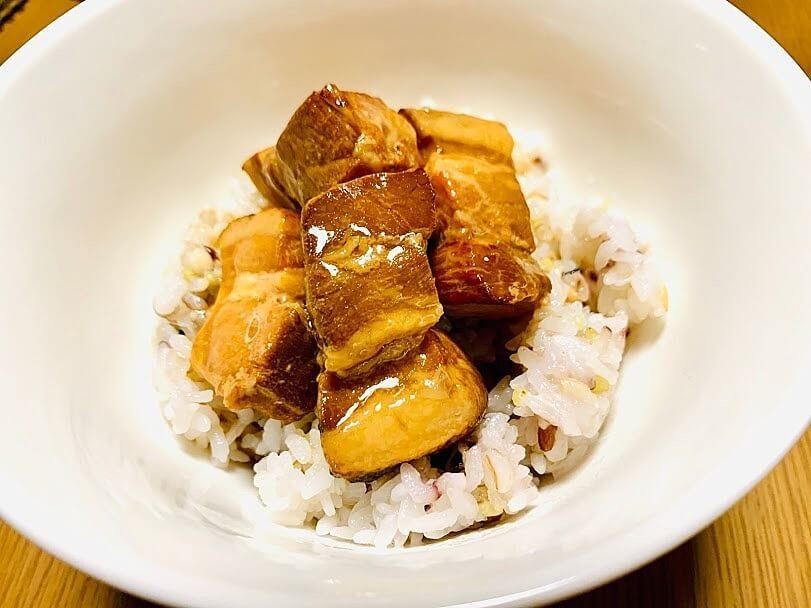 ご飯に乗せて角煮丼にしました!スープもご飯にたっぷりとかけました。