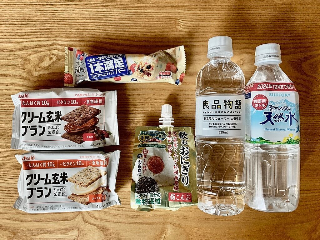 グッズのなかで水と食料がいちばん重くなります。多く持っていきたいところですが、背負って走って逃げるための非常用持ち出し袋です。重いと避難が遅れるので気をつけましょう。水は500mlを2~3本、食料はそのまま食べられるものを2~3食分でOK。