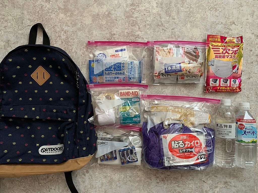 これらが入っていれば、銀色の袋のセットではなくても、自分が背負って逃げやすいリュックで大丈夫。