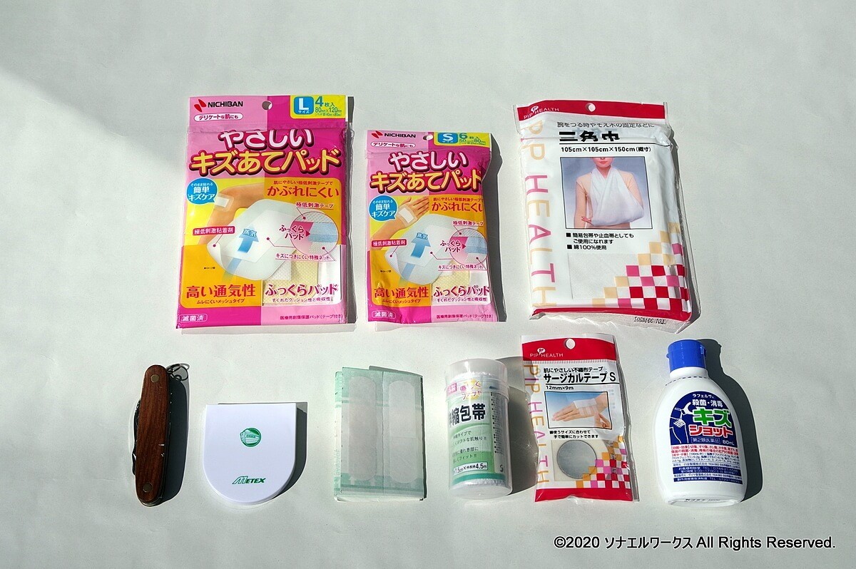 暗闇を照らすライト、雨具、ラジオ、救急セット、水・食料など