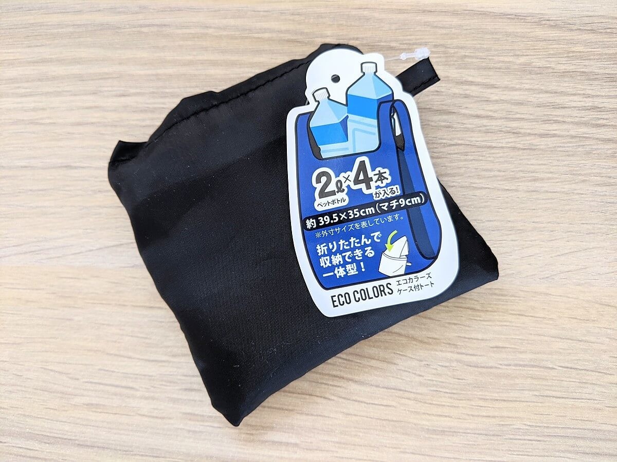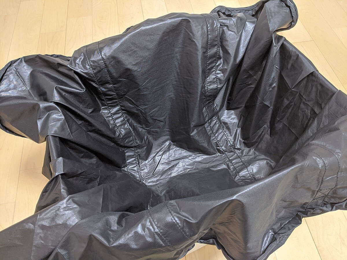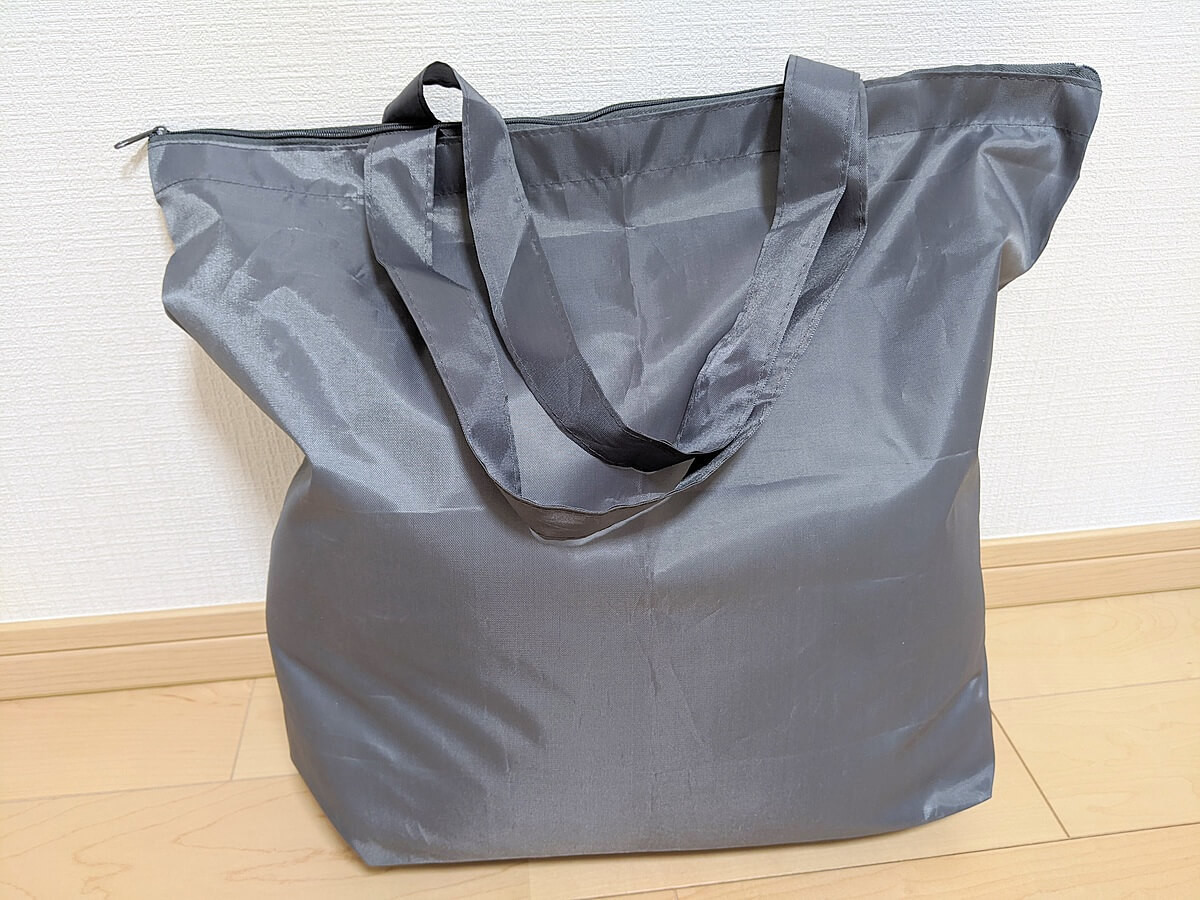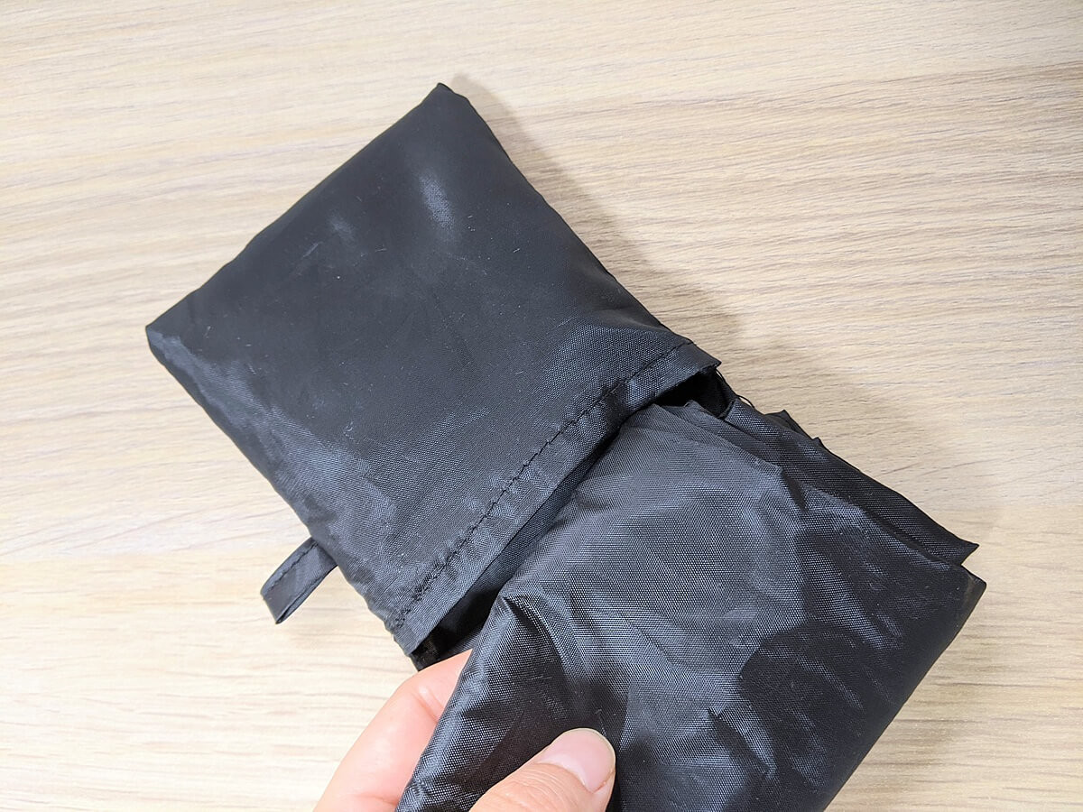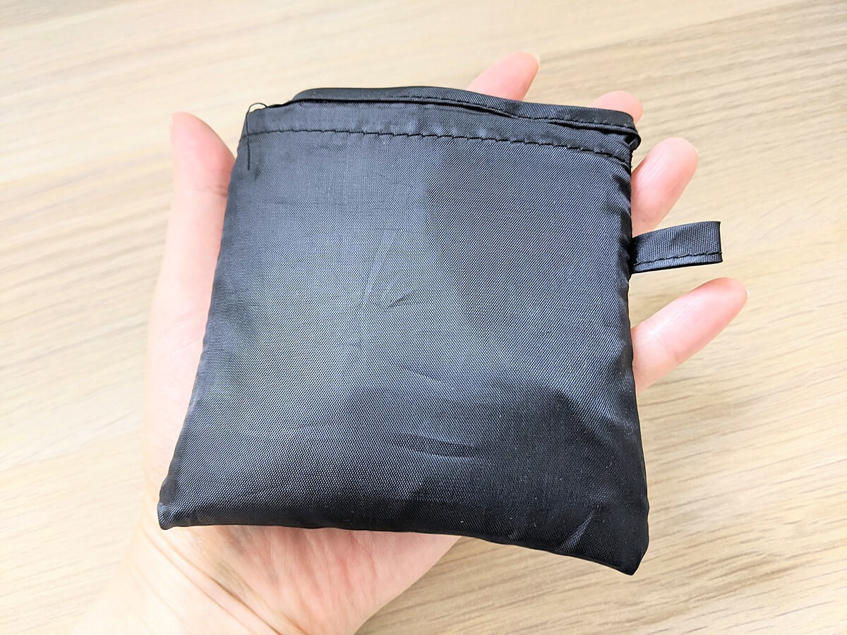カラーは黒のみ。素材はポリエステル100%で、重さは約105gと本当に軽いです。 荷物を入れるというよりは、包むといった方が良いかもしれません。