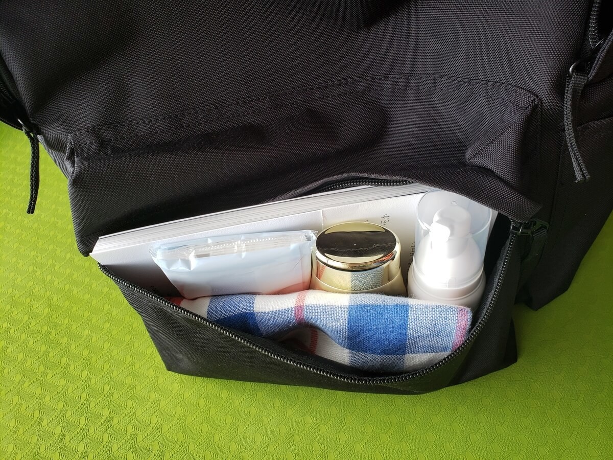 私の場合、仕事柄、折り畳み式ヨガマットを入れて持ち歩いています。