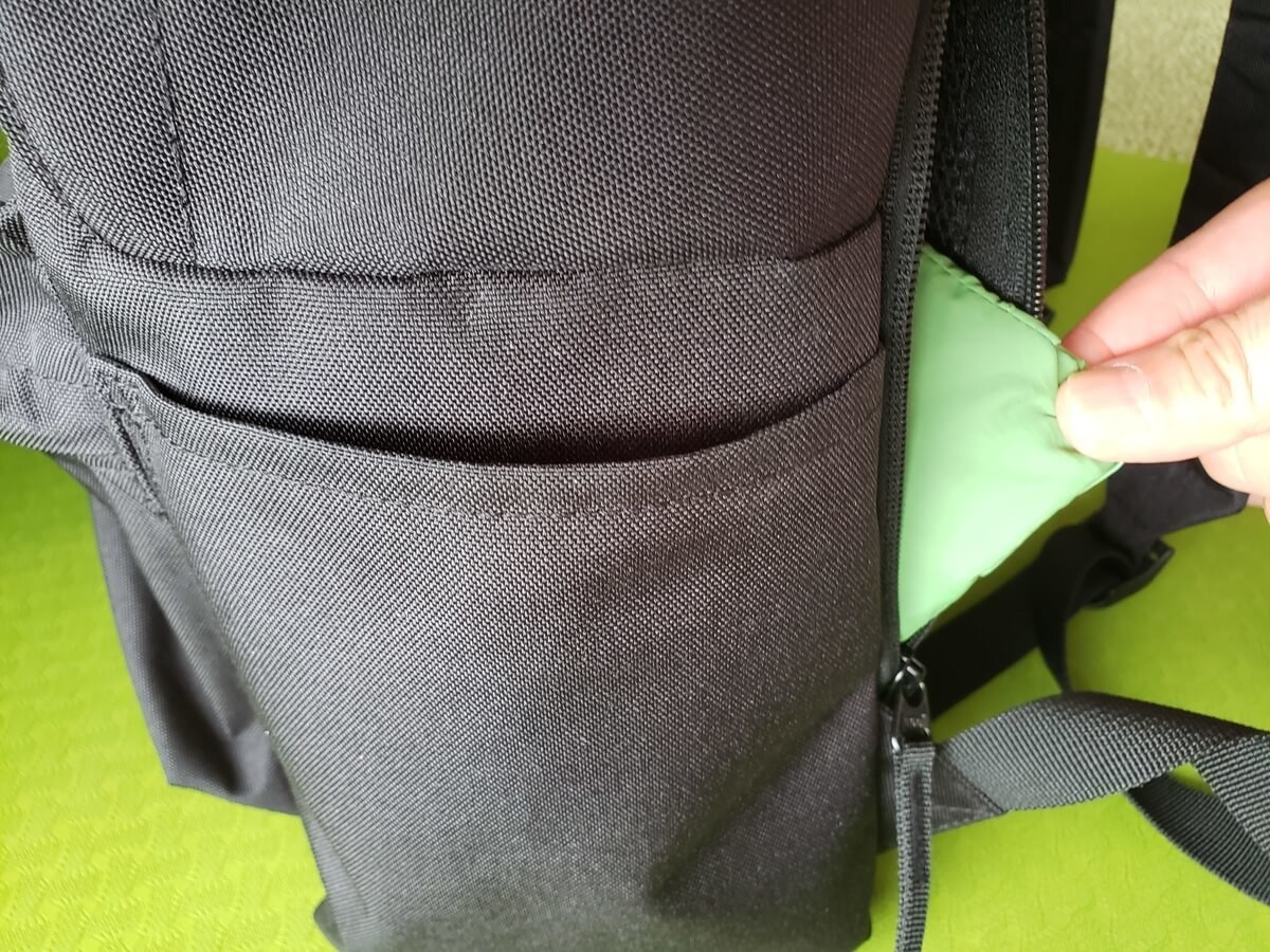 内ポケットの2つはメッシュで仕切られていて、1つは外のファスナーからもスムーズに物を取り出せるので、いざという時の為にエコバッグや、財布などを入れることもできます。