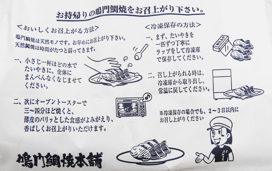持ち帰りから10分程しか経過していませんので、たいやきの表面はあたたかい状態。そのまま食べようとしましたが、たいやきを入れている袋の裏面に、たいやき持ち帰り時の食べ方について書かれていました。