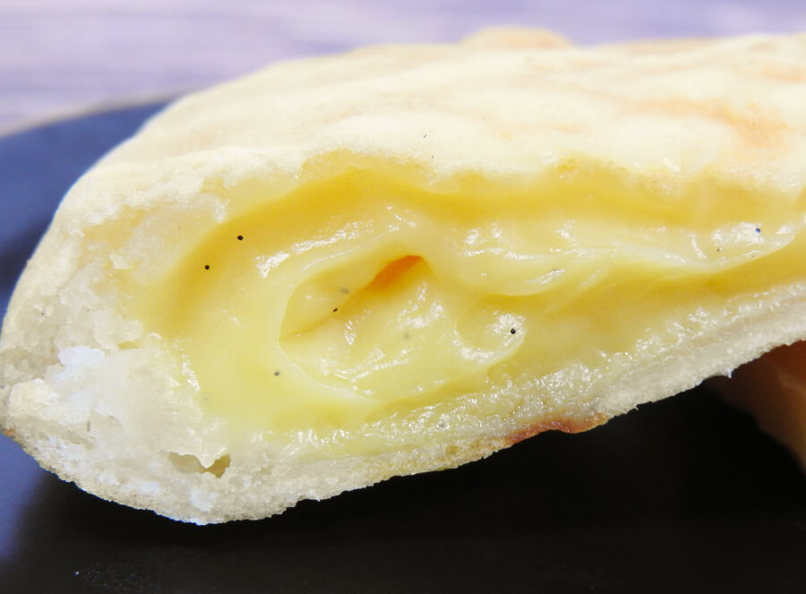 半分にカットすると、カスタードの香りが漂ってきて食欲をかきたてます。バニラビーンズが入ってますね。濃厚なカスタードクリーム……!皮の存在感がなくなるほど濃厚……!