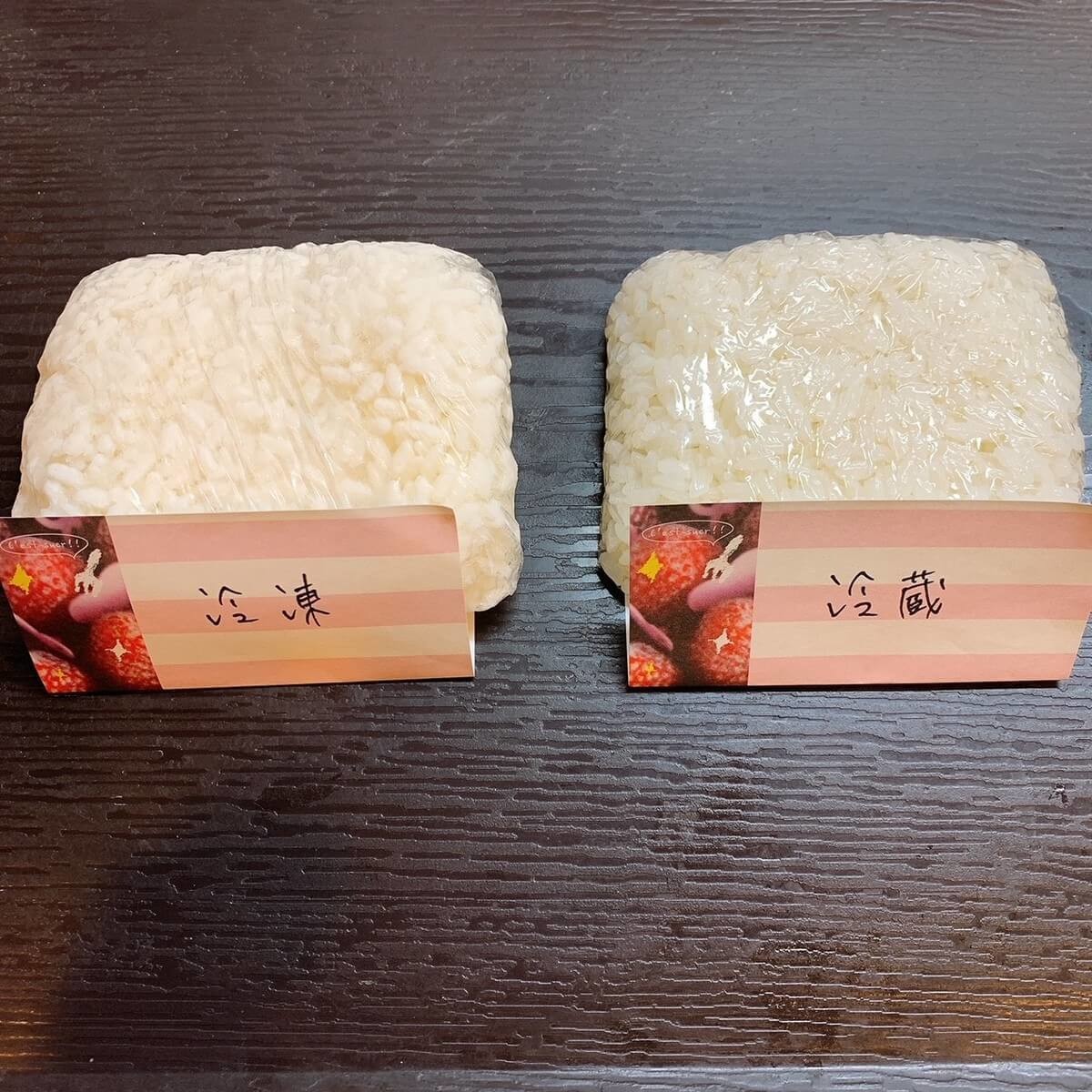 左側が冷凍室で保存したごはん、右側が冷蔵室で保存したごはんです。