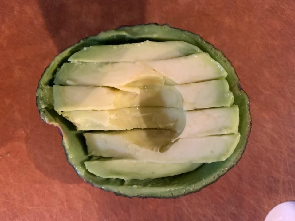商品パッケージにも、「アボカドの硬さによってはキレイにスライスされない場合がある」と記載されていますが、やはり硬いとかなり難しいです。