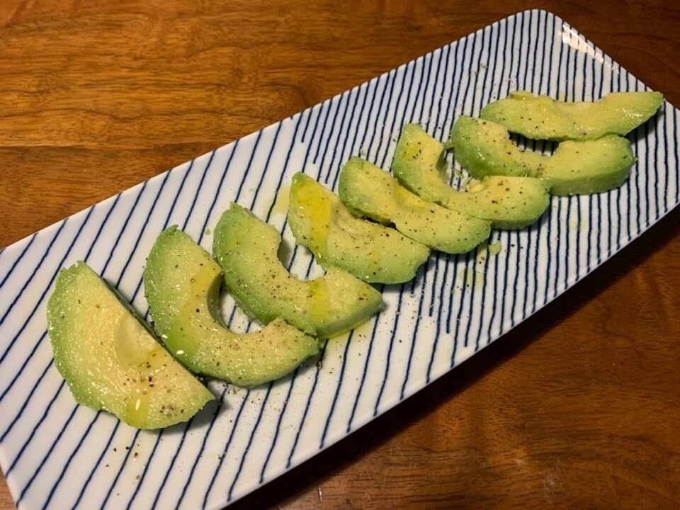お皿に並べて、塩・コショウ・オリーブオイルを垂らすと、「簡単アボカドスライス」が完成です!