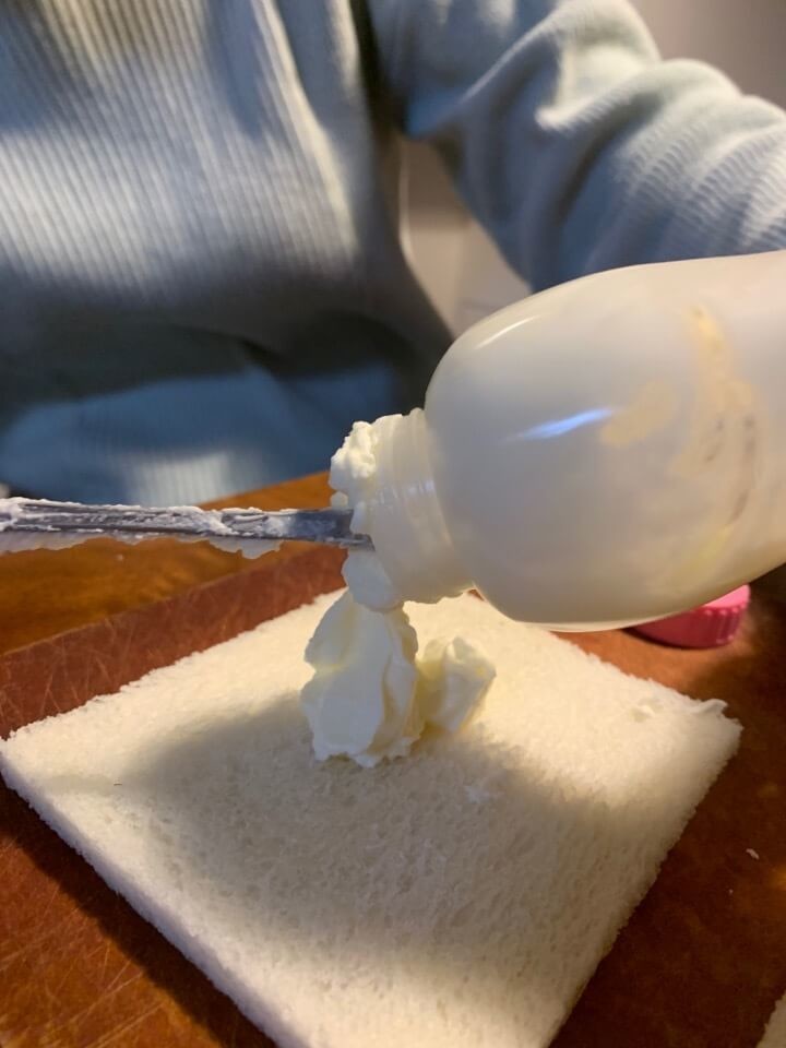 生クリームの状態や、容器の振り方などにより、もっと上手にできると思いますが……今回は「フルーツサンド」に使用したいのでこれでよしとします!