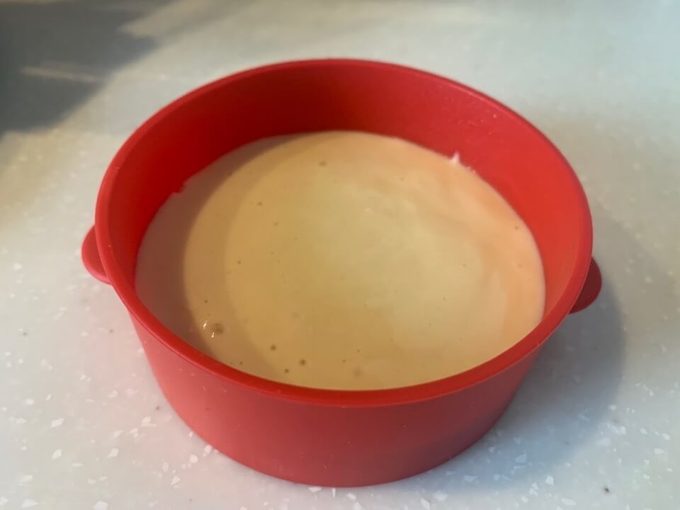 持ち手の高さまでホットケーキの素を入れます。内側にはバターやサラダ油を塗っておくと、あとから取り出しやすくておすすめです。