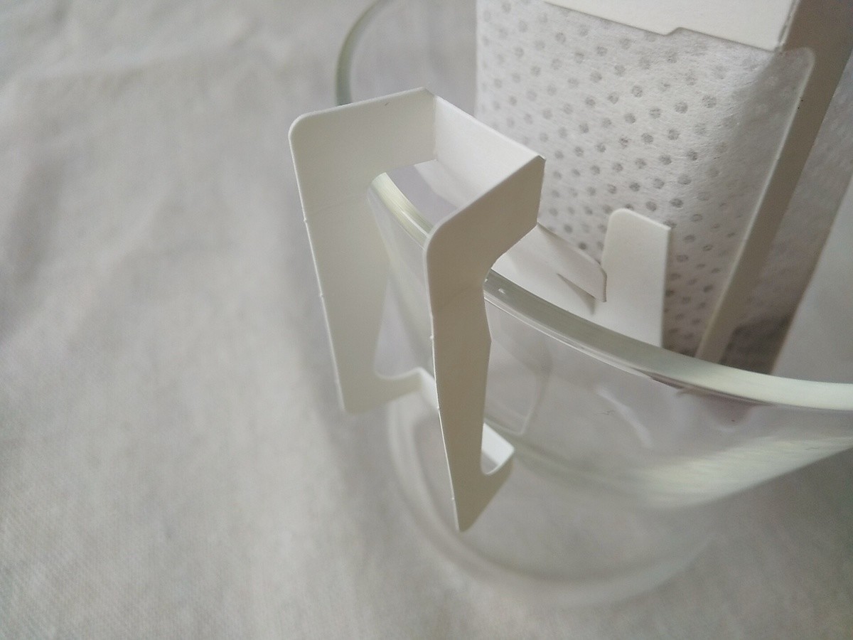 ①パッケージを開けたら、バッグの上側をはさみで切り取り、カップにセット。