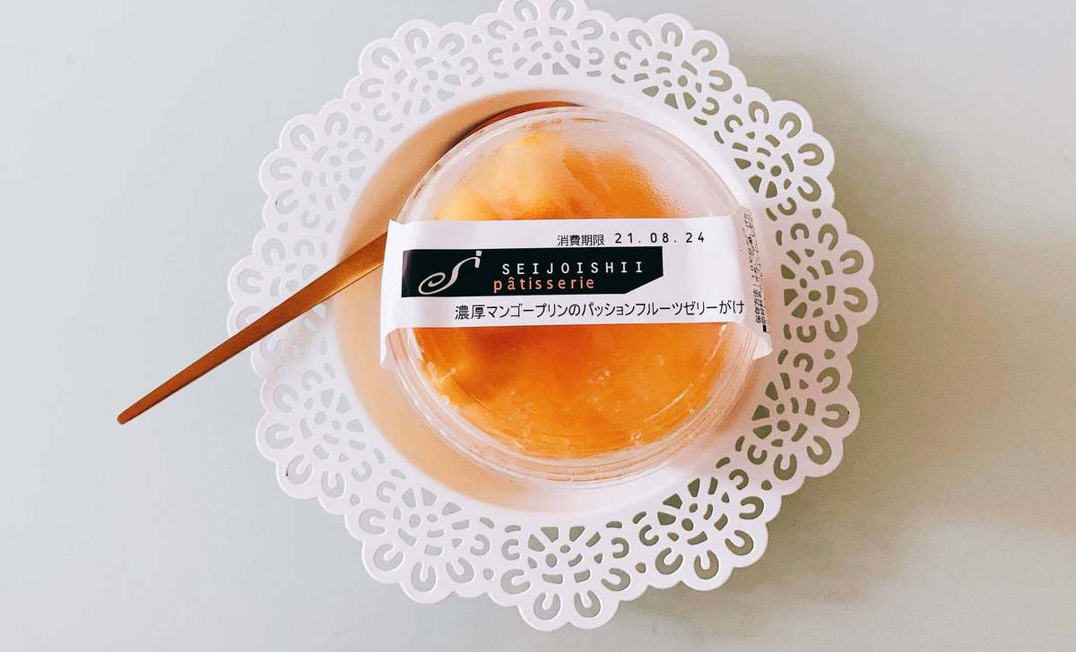 こちらは成城石井お馴染みのカップスイーツ。「濃厚マンゴープリンのパッションフルーツゼリーがけ」というもので、税込387円。