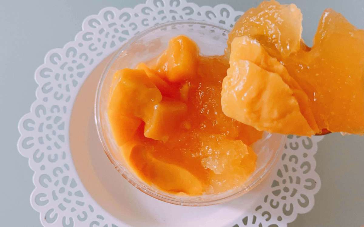 開けるとゴロゴロマンゴーとオレンジのような形のゼリーがドドン!マンゴーは全部で6個ほどでトロトロ甘く、パッションフルーツのゼリーはけっこう多めで想像以上に酸味がありびっくり。でもそれには理由が。