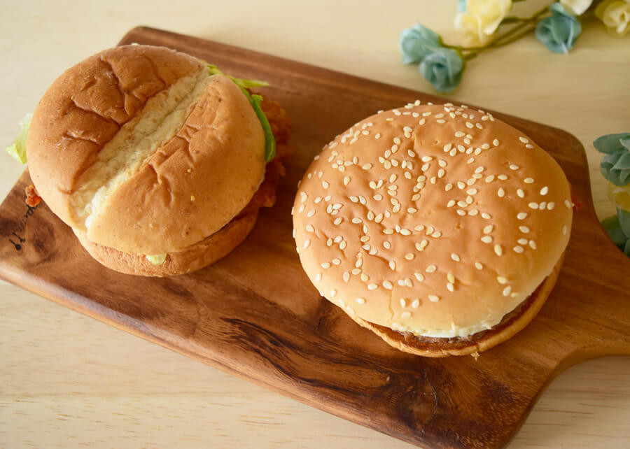 写真左がケンタッキー「とろ~り月見チキンフィレサンド」で、右側がマクドナルド「月見バーガー」です。バンズの大きさは両者とも同じくらい。