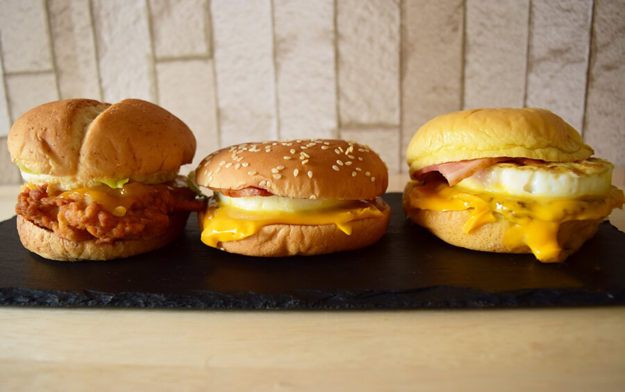 ▲写真左:ケンタッキー「とろ~り月見チーズチキンフィレサンド」、中央:マクドナルド「チーズ月見」、右:マクドナルド「濃厚とろ~り月見」