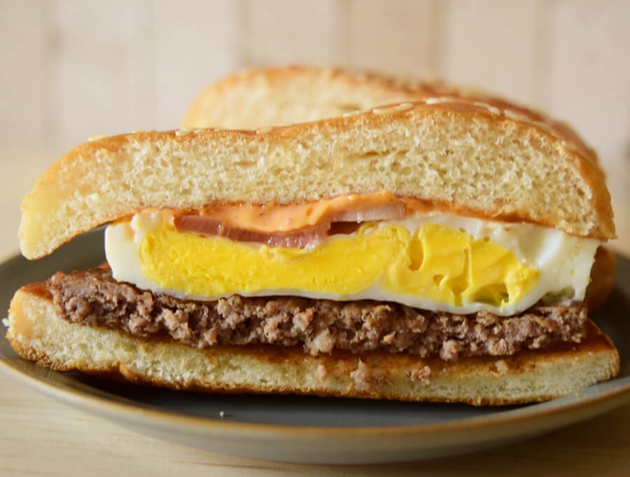 まずは、マクドナルド「月見バーガー」をみてみます。たまごの黄味は固まっているタイプですね。