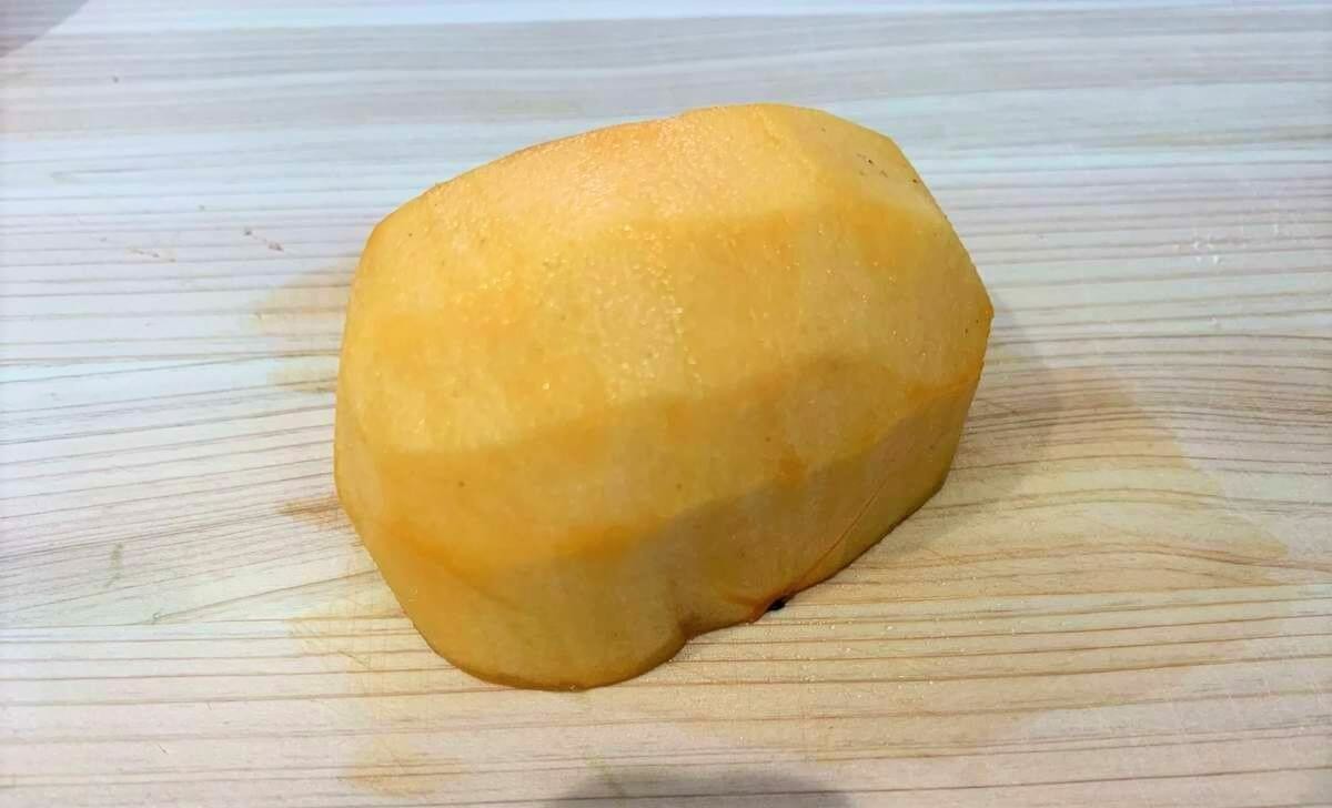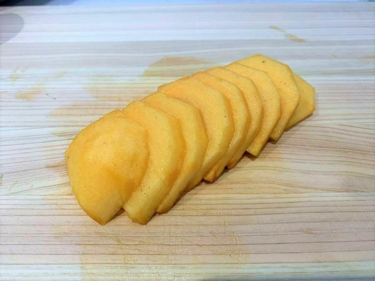 熟れすぎた柿のトースト①柿の皮をむき、薄切りにする