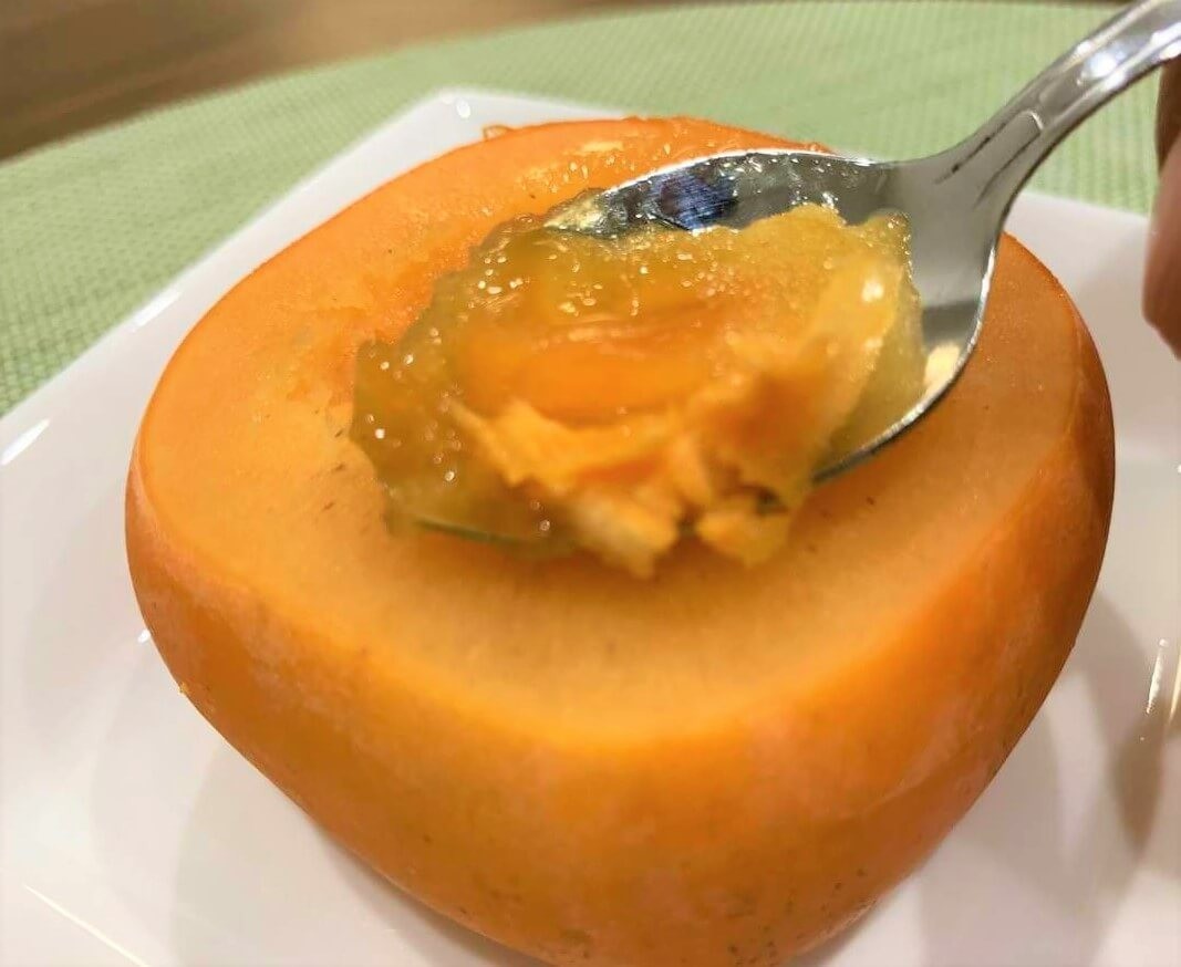 スプーンですくって食べてみると、めちゃくちゃびっくり。柿シャーベット、想像よりずっと美味しいです!!冷たいけどしっかり甘くて、ちゃんとシャーベットになっています。