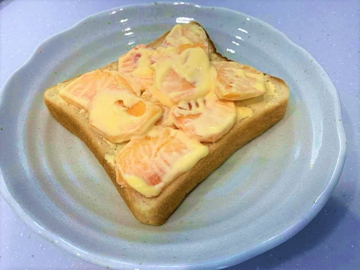 まずは、テレビ番組「相葉マナブ」で紹介された、柿を食パンにのせて食べる【柿マヨトースト】の作り方を紹介します。