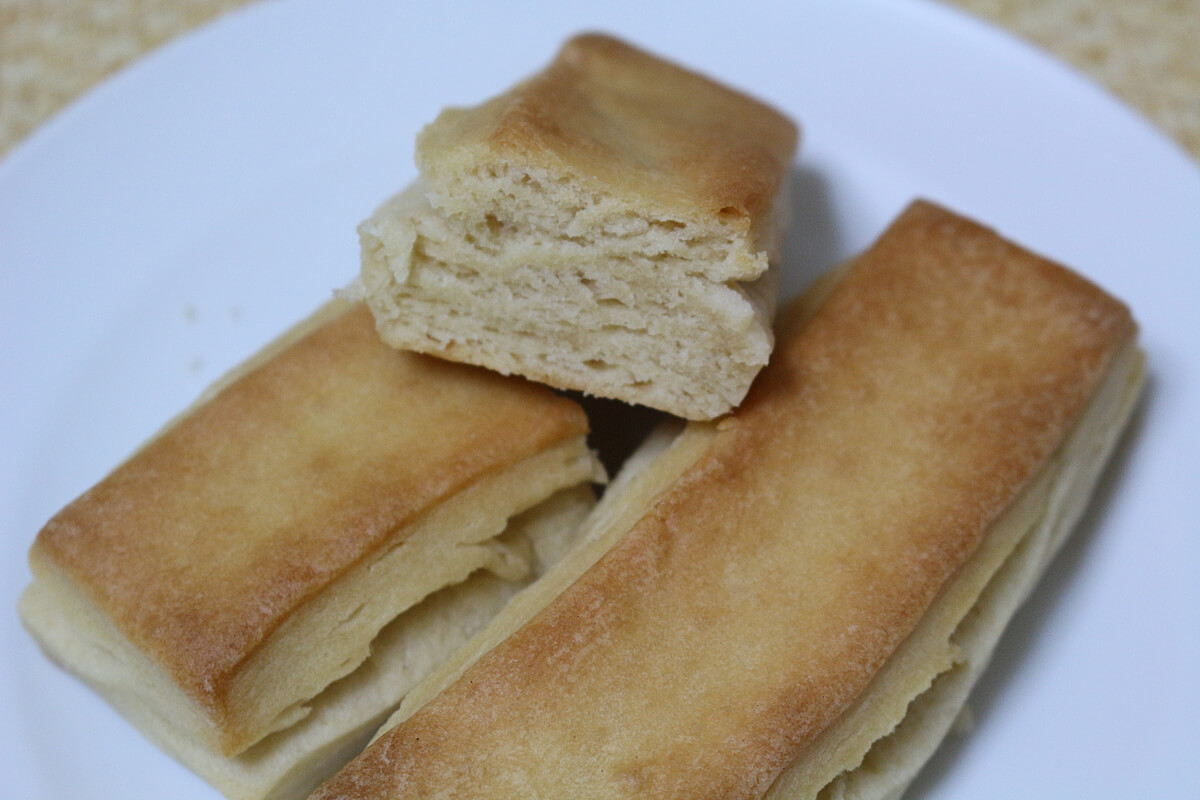 セブンプレミアムの商品は、発酵バターが入ったバター風味のチップマーガリンを混ぜ合わせ折り込んで焼き上げたサクッとした食感のビスケットです。