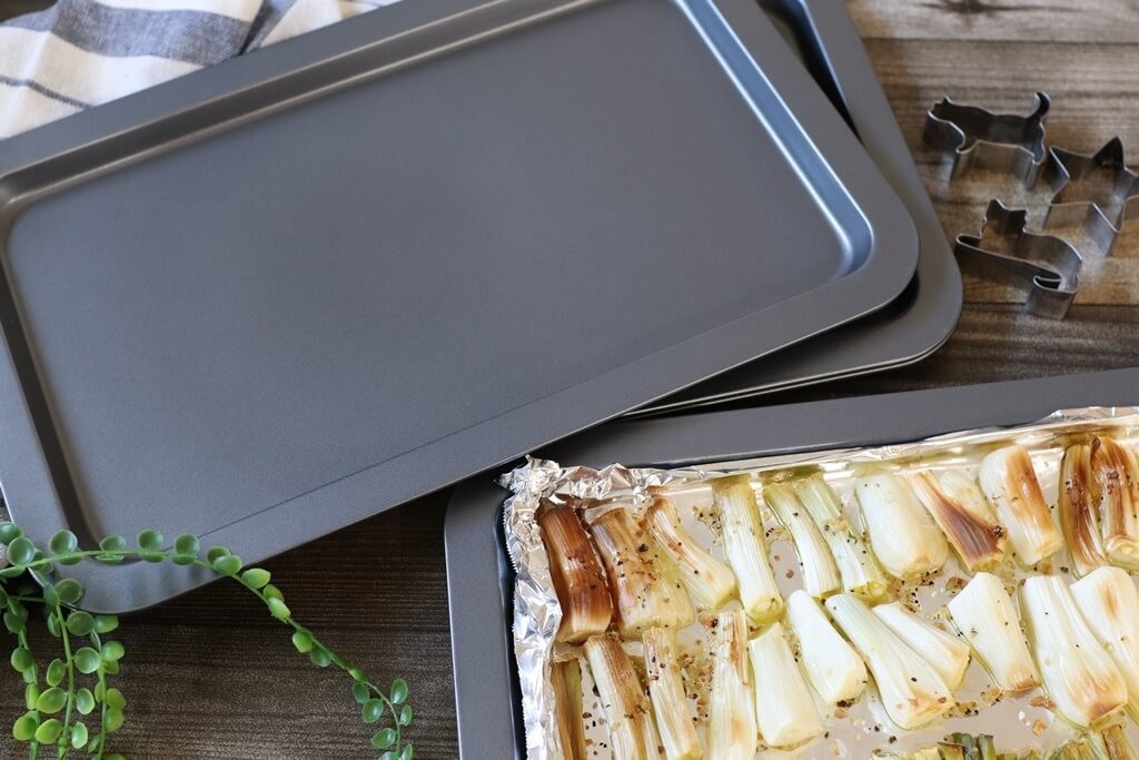 使い心地が気になったので早速料理に使ってみました。ベイキングトレー事態にフッ素樹脂加工されているので、食材はくっつきにくくなっているのですが、長く使用したいため今回はアルミホイルを敷いて使用しました。