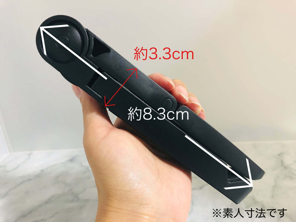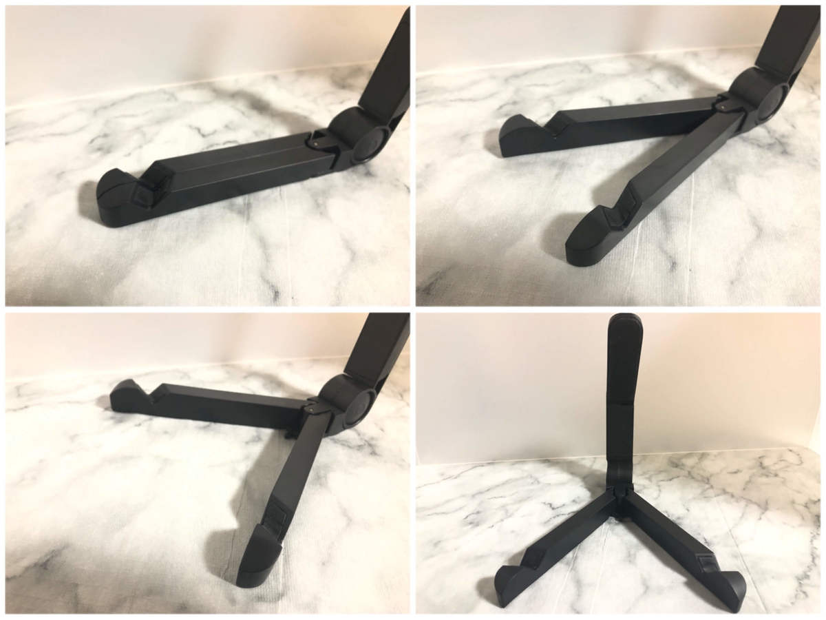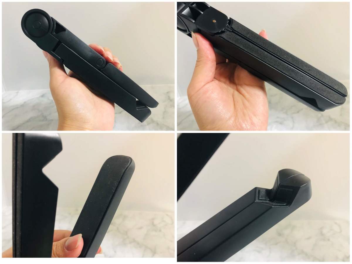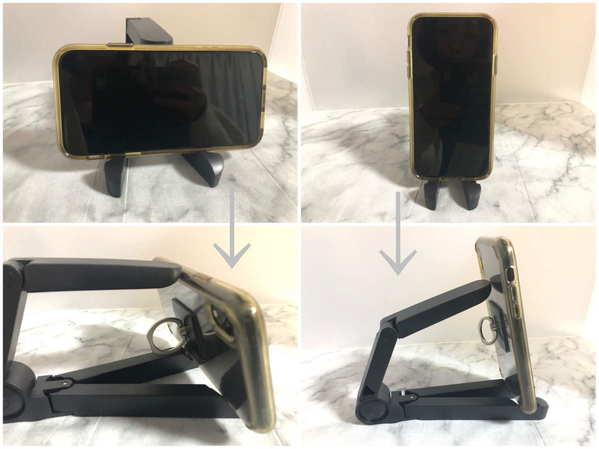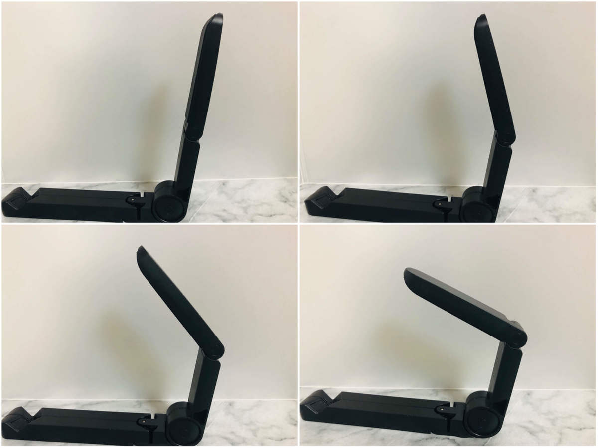 そして上部は、このように角度が折れるようにもなっているので、スマホなどの小さめのアイテムでもしっかりと支えてくれます。